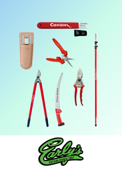Corona Leather Scabbard | Corona Sharpening Tool | Corona Bypass Pruner (cuts up to 1”) | Corona Micro Snip Comfortgel Handle | Corona Lopper Bypass | Corona Flexreach Pole 15’ Pole Saw/Pole Pruner | Corona Flexreach Saw Head / Pole Saw